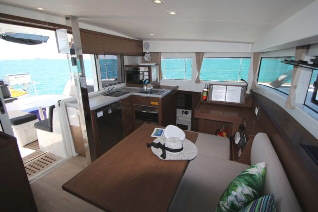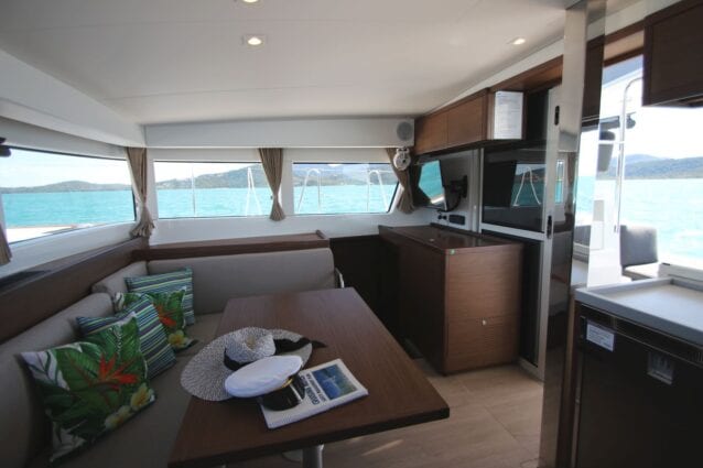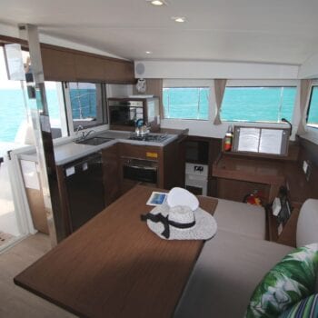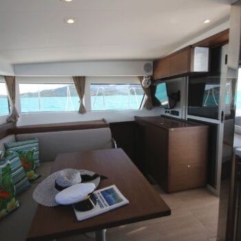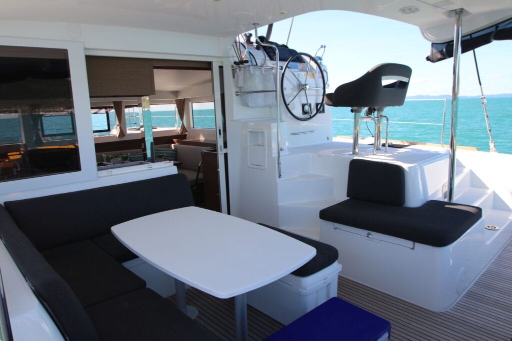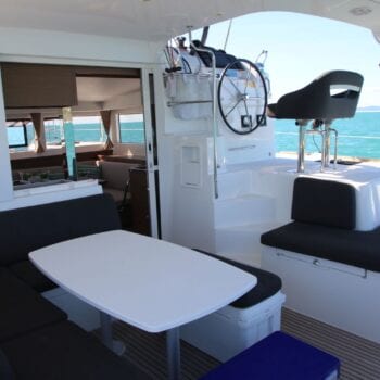 The Lagoon 40.4 G sailing catamaran has superb living space and the cockpit is spacious and comfortable, with built-in dining and bench seat.