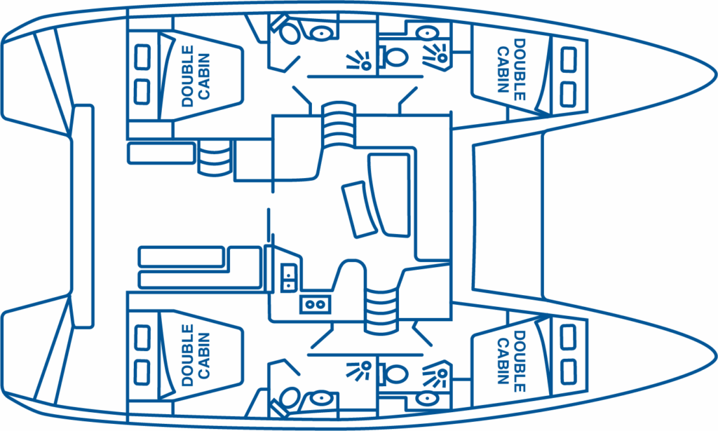 The Lagoon 42.4 can sleep up to ten guests: four double cabins, four bathrooms, plus the saloon table that converts to an additional double berth. The cabins feature hatches for ventilation and generous headroom, and all beds have side or island access.
