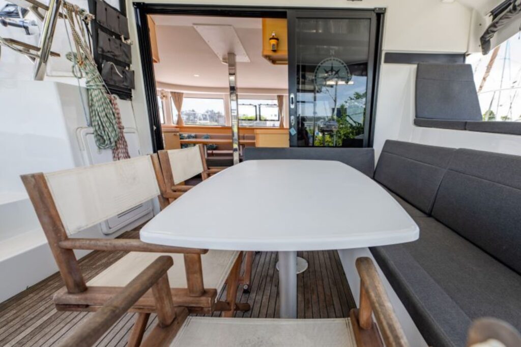 The Lagoon 40.4 G features a spacious cockpit complemented by teak decking and a raised helm for great visibility.