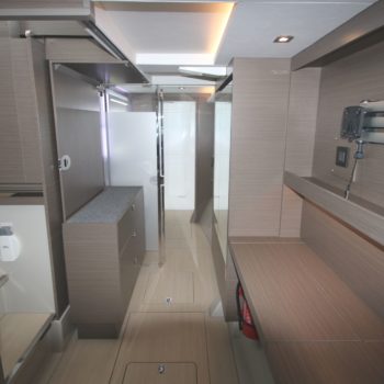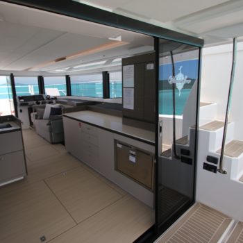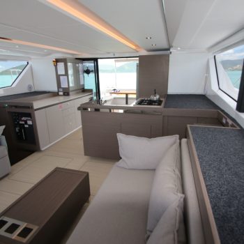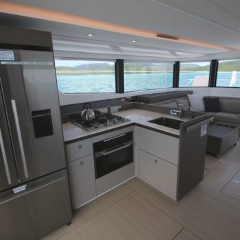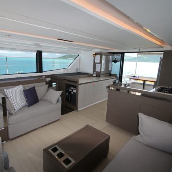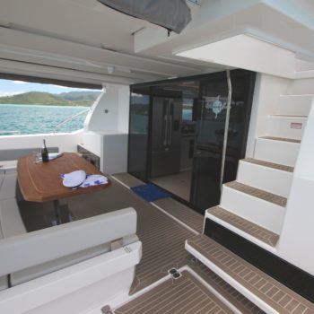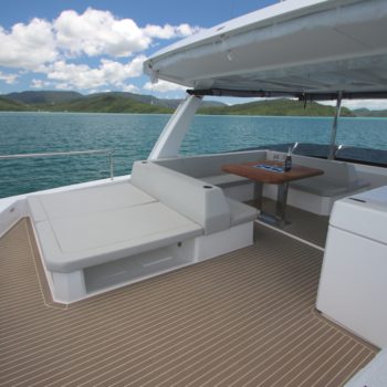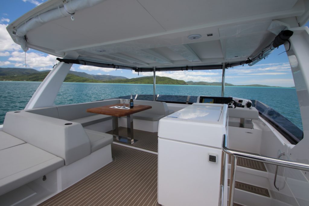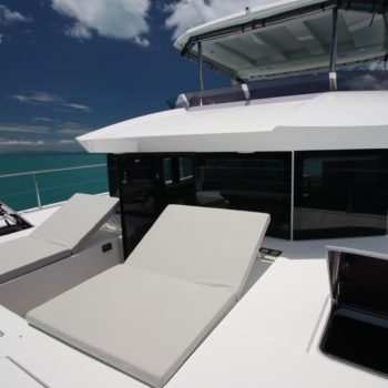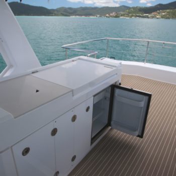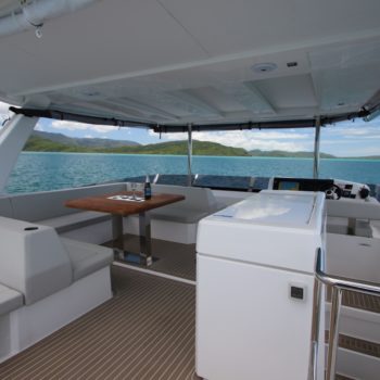 This well equipped power catamaran features a sizeable shaded flybridge with dining table, fridge and large sunbed. The rear deck has increased space with a Hydraulic Swim Platform.