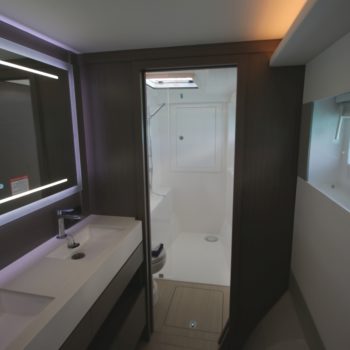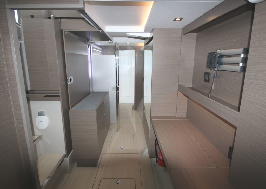 Sleeping up to 8 people, this three-cabin owner’s suite boasts a large walk-through closet, desk, and a double vanity. Forward VIP guest cabins offer spacious, island berths and ensuite bathrooms.