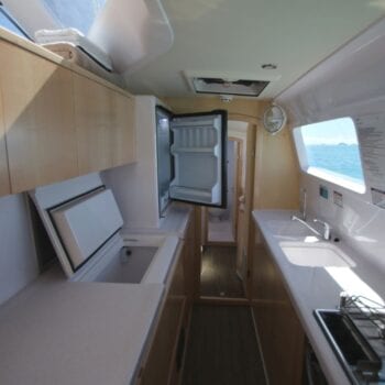 The ample head room, the generous refrigeration space, and the roomy covered cockpit that fully opens into the saloon make for very comfortable cruising.