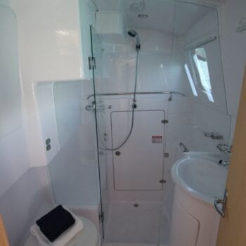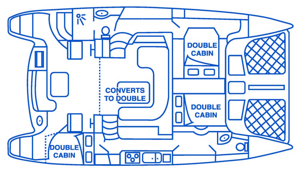For sailing performance; a full batten main. For easy sailing; all ropes are led to the cockpit. She has a roller furling self-tacking headsail, twin steering and an autopilot for the discerning sailors. Suitable for three couples, two families and mixed groups. She will also perform equally well under power.